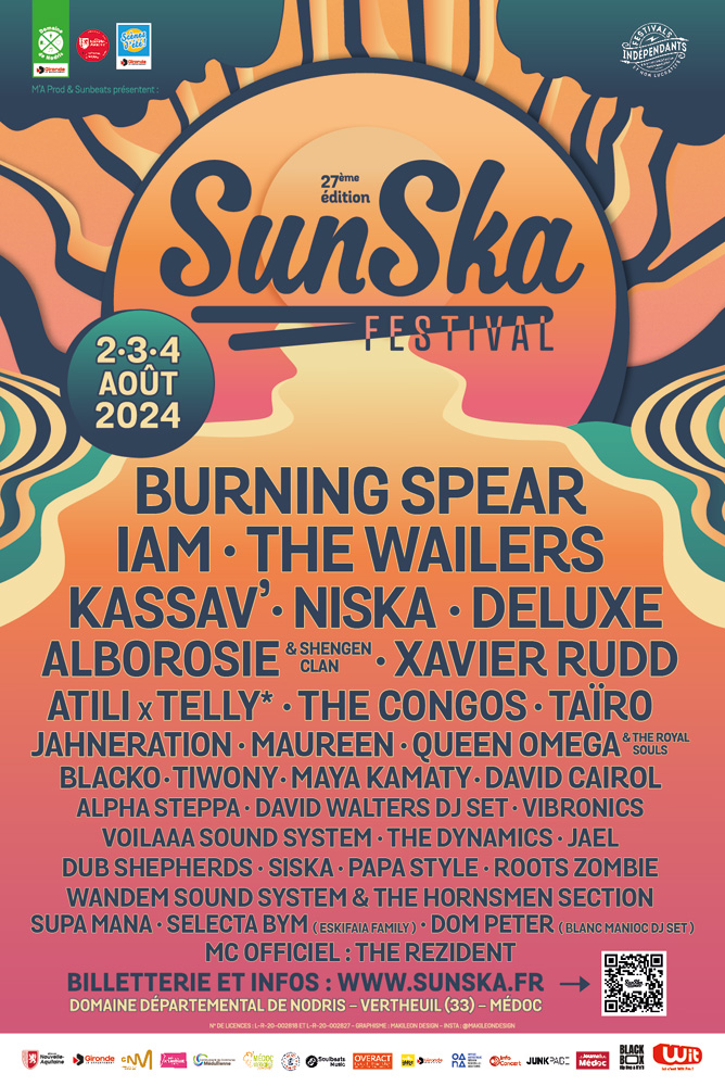 Rendez-vous les 2, 3 et 4 Août 2024 pour la 27ème édition du SunSka Festival sur le Domaine de Nodris à Vertheuil, à quelques kilomètres des plages Girondines, avec deux grandes scènes jumelées et la scène Sound System sur lesquelles vous retrouverez entre autres Burning Spear, IAM, The Wailers, Kassav’, Deluxe, Niska, Alborosie, Xavier Rudd, The Congos, Taïro, Jahneration, Maureen, Queen Omega, Blacko, mais aussi côté Dub : Atili x Telly*, Alpha Steppa, Vibronics, Jael, Dub Shepherds, Roots Zombie, le Wandem Sound System et de nombreux autres artistes !