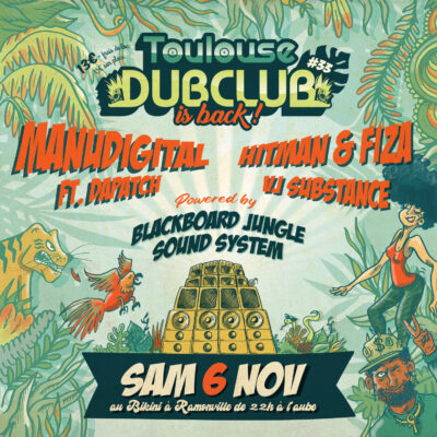 Prêts pour la 33ème Toulouse Dub Club ? Réouverture de la danse pour une session 100% française le Samedi 06 novembre 2021, au Bikini ! Avec le fameux collectif BlackboardJungle Sound System, le roi du reggae digital Manudigital en ft. avec Dapatch, le talentueux duo toulousain Hitman & Fiza, le tout mis en image par VJ Substance, la richesse de la scène sound-system hexagonale sera à l’honneur !