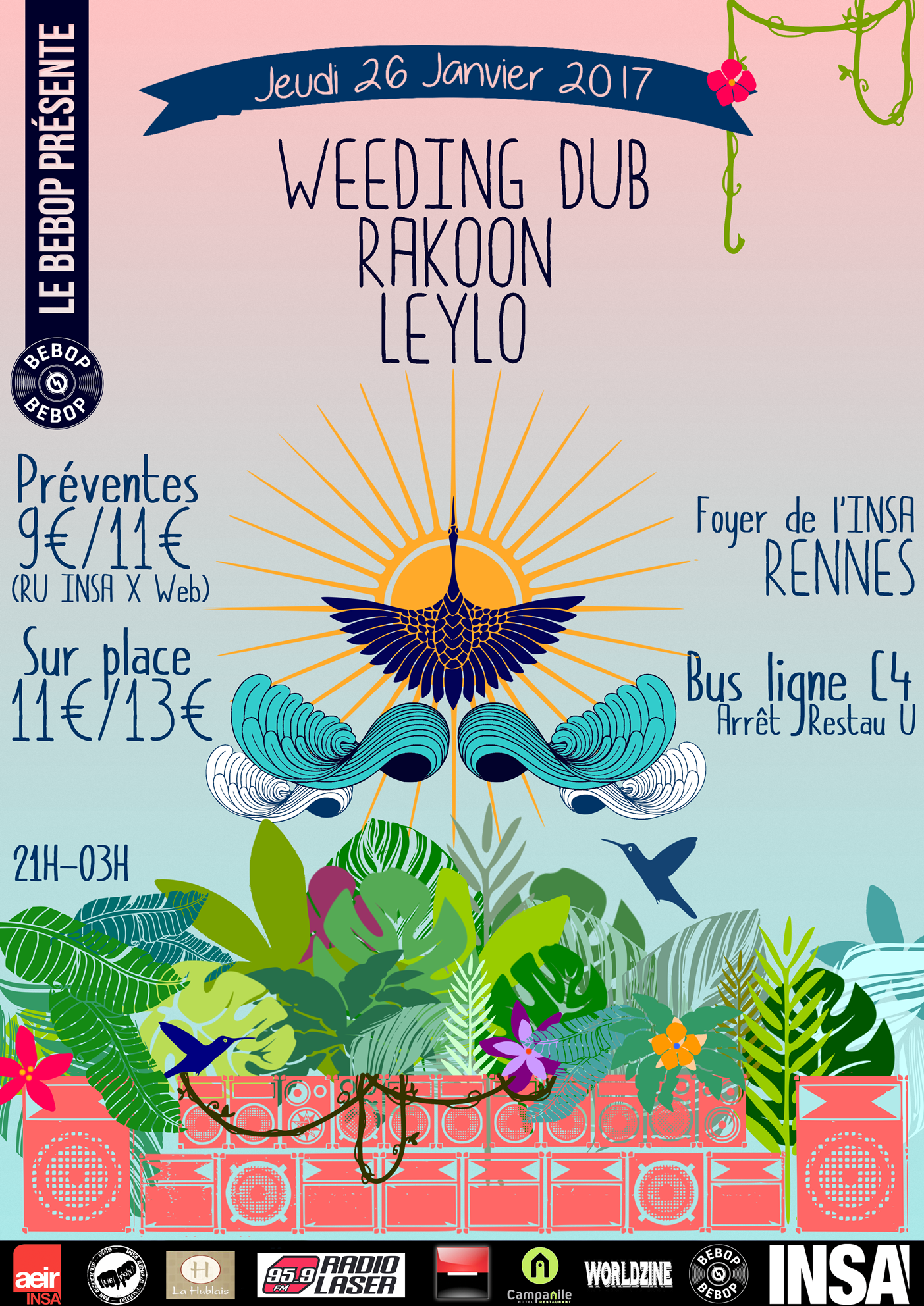 Le 26 janvier prochain au Foyer de l’INSA à Rennes le Bebop accueille WEEDING DUB, RAKOON et LEYLO ! On vous promet une grosse dub session qui fera vibrer vos tympans et corps de 21h à 03h du matin ! Préventes en ligne sur l’événement et au self de l’INSA midi et soir à partir du 16 janvier. 11€ en prévente 13€ sur place.