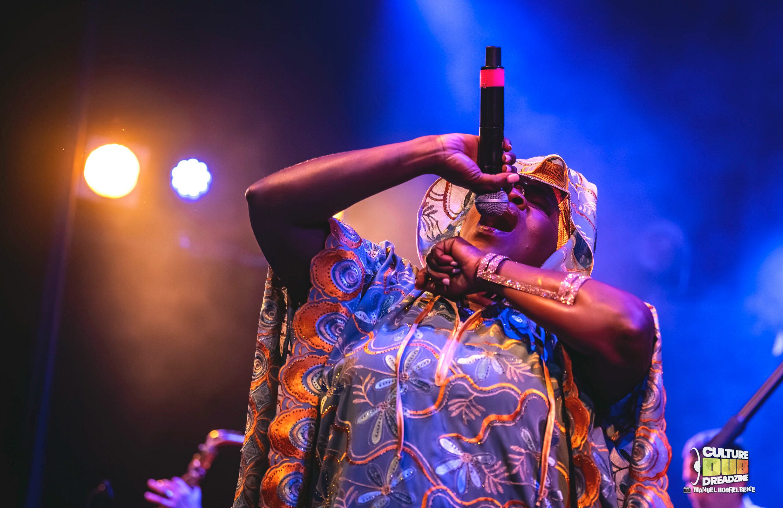C’est au tour de Queen Omega & The Royal Souls Band de fouler les planches du Bateau Ivre. L’introduction se déroule sans la chanteuse, en mode instrumental, mais la désormais nouvelle légende du Reggae ne se fait pas attendre bien longtemps. Les Voix chaleureuses de ses deux choristes font monter la température, tandis que la Reine se montre sous les applaudissements du public. Du Reggae percutant, où viennent se mêler des rythmes tantôt Hip-hop, tantôt Soul, dont les spectateurs se délectent et reprennent une bonne partie des paroles, ou dansent durant cette seconde partie de soirée, dans une salle bondée !