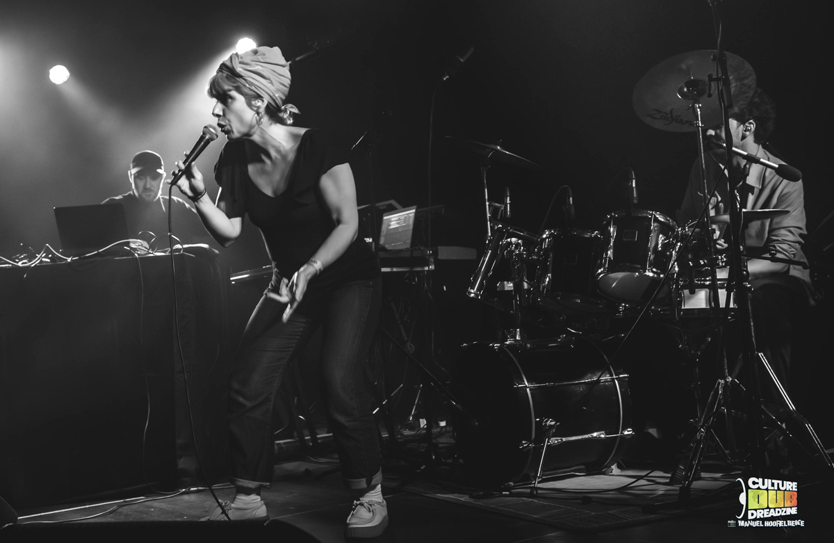 Marina P & The Radiators ont débuté la soirée, par le set aux teints Roots et Blues, en mode Live Band (et Live Mix), installant d’emblée une ambiance chaleureuse dans la salle tourangelle. La voix envoûtante de Marina P, portée par les rythmiques solides des Radiators, composé d’Olo (Ondubground) au live mix et d’Alexis Bruggeman (que l’on peut également croiser sur scène aux côtés de Biga*Ranx), a su mettre le public dans les meilleures conditions, pour cette soirée bien garnie. Huit ans après la soirée de leur EP sortie chez OPG Prod, la voix envoutante de Marina P se marie toujours aussi bien aux instruments. Elle qui se prépare à sortir son nouvel album « Know Nothing About » avec les Co-Operators, semble toujours aussi à son aise avec ses deux acolytes. Une belle mise en abîme proposée par le trio, que le public a apprécié !