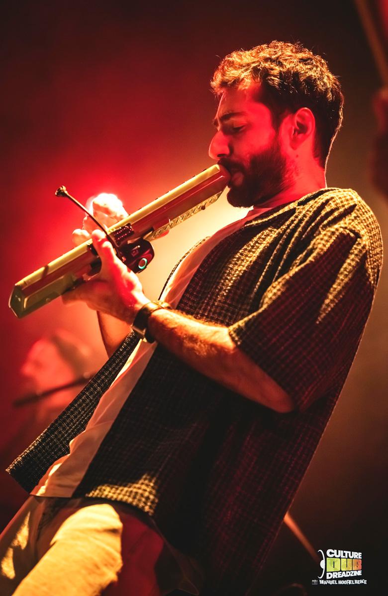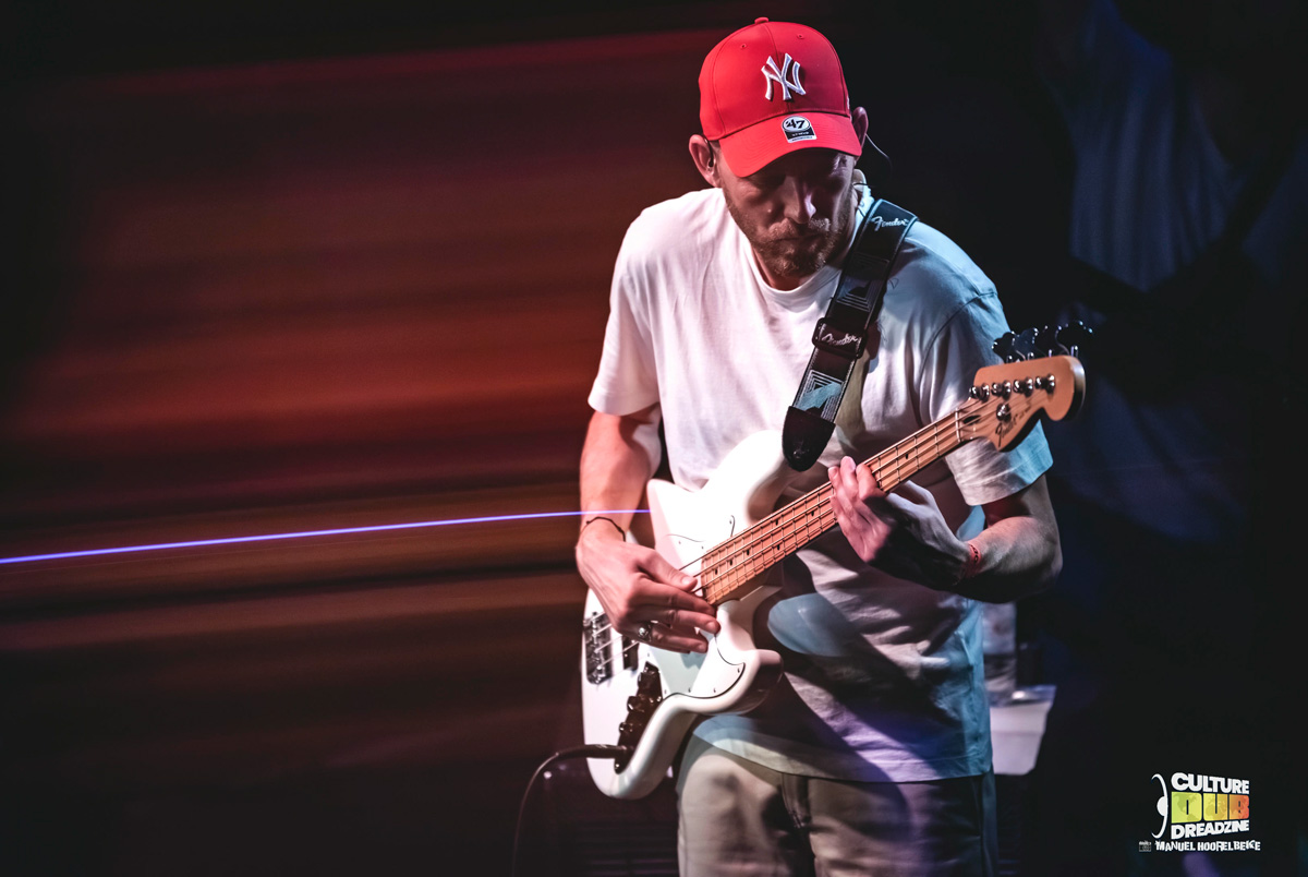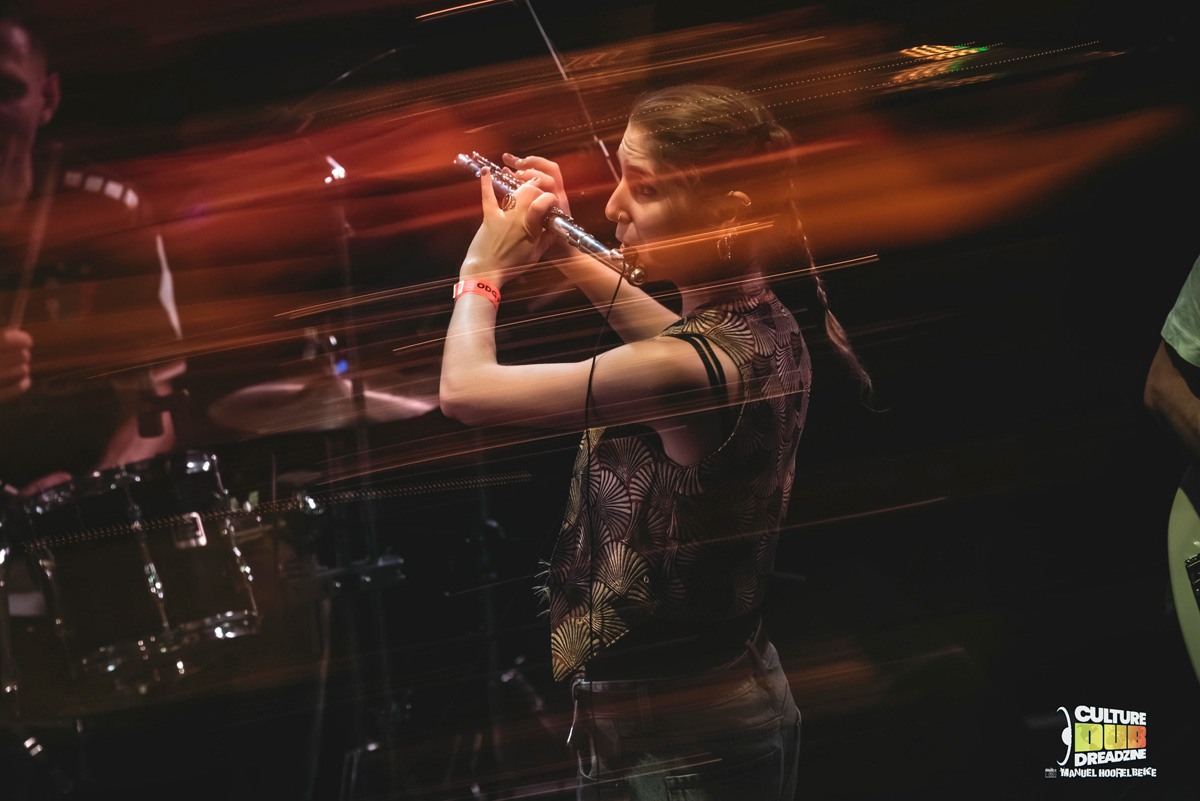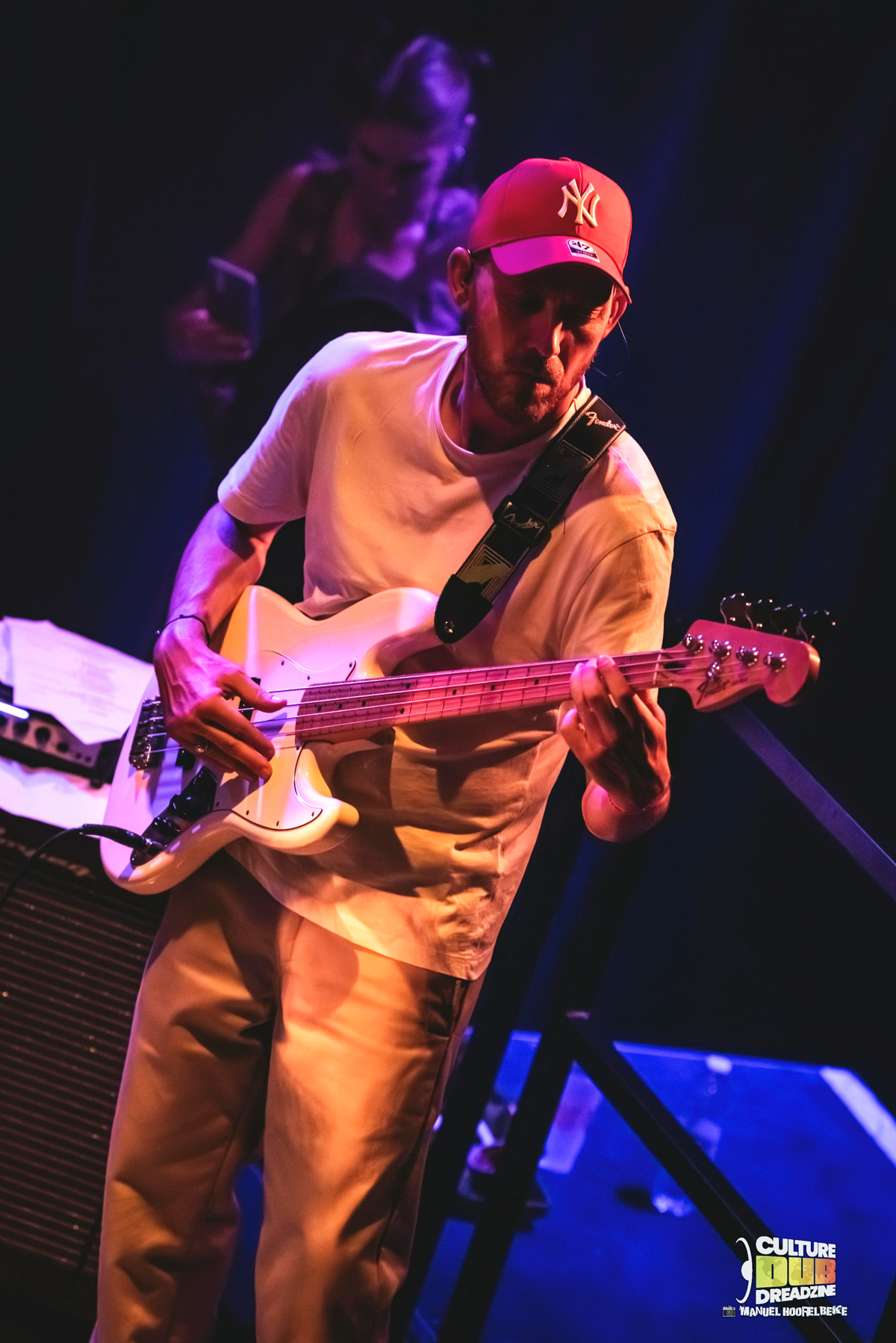 Enfin, Art-x & The Roots Addicts ont clôturé cette soirée, présentant leur album « The Haven » dans son écrin naturel : la scène. Entre morceaux inédits et titres déjà familiers du public, le collectif a démontré toute la maturité de ce nouveau projet, offrant une prestation énergique qui a fait vibrer Le Bateau Ivre jusqu’aux premières heures. Ce n’est pas la première fois que les membres de The Roots Addict collaborent avec l’artiste et producteur Art-X, ils nous avaient déjà proposés deux opus « Under Mi Kultcha » (2016) et « Polarity » (2020). « The Haven » sortait donc ce 24 septembre, et nous avions déjà pu écouter les titres ‘Rising from Ashes‘ et ‘Black Cat’ (ft. Youthie) quelques jours auparavant. Au fil de la soirée les titres nous ont donc été offert, entre quelques productions plus anciennes issues de leurs précédentes collaborations. Les cinq musiciens nous ont offert une prestation magistrale, dans cette salle qui se prêtait admirablement à ce type de soirée, mais ils ont également tenu à partager ce moment avec ses invités : Zian, pour un duo de Melodica sur ‘Musical Town‘, ou Lou From The Couch, au chant sur le titre ‘Undiscovered Treasure‘ que l’on retrouve dans ce dernier opus, comme pour le titre ‘Black Cat‘ ou Youthie remonta une dernière fois sur scène parée de sa flûte. Ils nous joueront enfin ‘Fantasia‘ (produit par Kanka).
