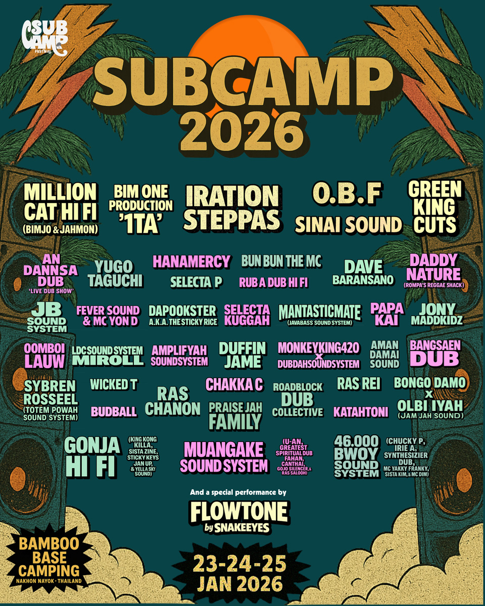 Le festival SUBCAMP est de retour du 23 au 25 janvier 2026 au Bamboo Base Camping, à Nakhon Nayok, en Thaïlande. Quatre sound systems thaïlandais se succéderont tout au long du week-end : Million Cat Hi Fi, Muangake Sound System, 46000 Bwoy Sound System et Gonja Hi Fi, sur lesquels joueront entre autres Iration Steppas & O.B.F, Bim One Production, Sinai Sound, Green King Cuts, Hanamercy, An Dannsa Dub, Daddy Nature, Rub A Dub Hi Fi, Olbi Iyah, Katahtoni, Amplifyah Sound System, Praise Jah Family, Oomboi Lauw, Yugo Taguchi, Bun Bun the MC, Ras Rei, Budball, Chakka C, Fever Sound, Roadblock Dub Collective, Mantasticmate, Dave Baransano, Selecta P, Jony Maddkidz, Aman Damai Sound et LDC Sound System !